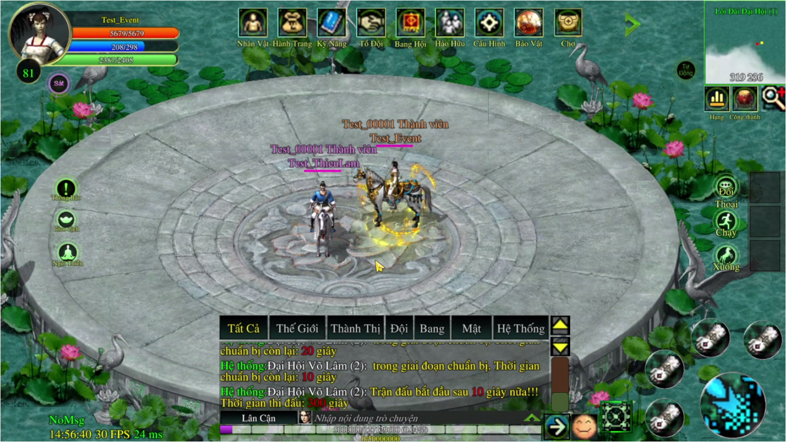 Tăng 5.000.000 EXP tất cả nhân vật Lưu ý: Khi Bắt đầu đánh nếu thoát acc hoặc bị mất kết nối mạng, sẽ bị loại trực tiếp. |